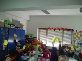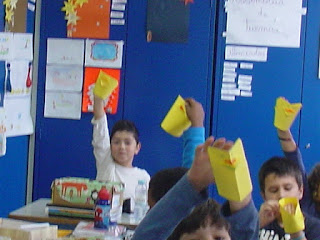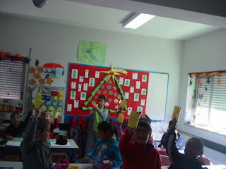 Depois de uma pequena exploração oral, registaram as suas conclusões numa ficha de compreensão da leitura. Com alguma ajuda, construíram em ORIGAMI os seus pintos borrachudos que, colocados nas suas mãos como pequenos fantoches, diziam